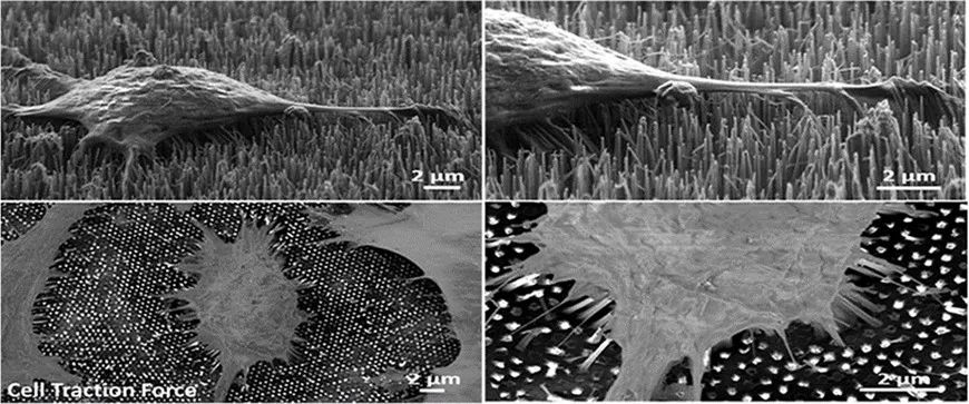 该研究团队一直聚焦细胞牵引力的精确测量方法和器件研究。早在2009年,李舟和王中林就提出基于硅纳米线阵列测量细胞牵引力的方法,研究了正常细胞、良性和恶性肿瘤细胞的最大细胞牵引力的差异(Nano Letter, 2009, 9, 10:3575-3580)(图1)。通过利用扫描电子显微镜(SEM)获取硅纳米线阵列上由细胞引起的弯曲情况,结合纳米线的物理性能参数和位移数据进行统计分析,能够准确获得施加在纳米线上的细胞牵引力的大小。该工作是无机纳米线阵列在细胞牵引力研究中的新尝试,结合正常细胞和肿瘤细胞的细胞牵引力分析,对研究疾病的发生和发展过程提供了新的研究方法和技术手段。