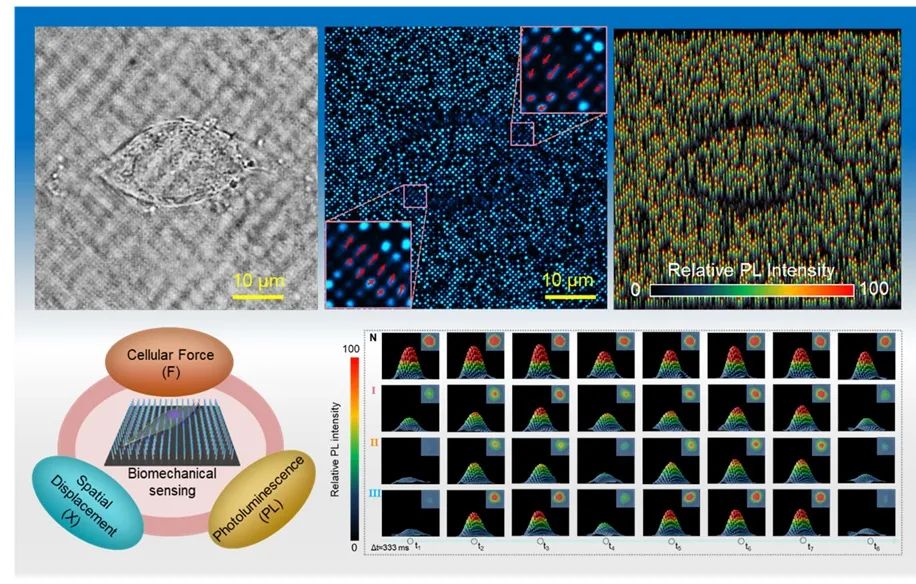 图5. 通过InGaN/GaN多量子阱的纳米线构建细胞力与光致发光强度变化关系以及强度时阈变化图.