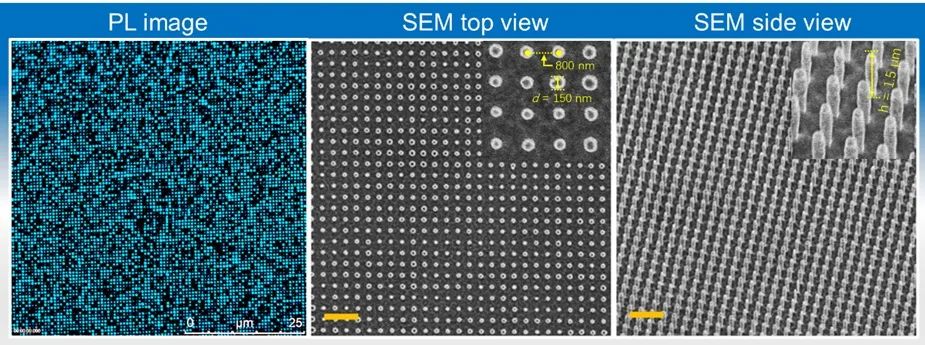 从硅纳米线到压电光电子学InGaN/GaN多量子阱纳米线,在材料本身获得改进的基础上,面向细胞牵引力的测量,其性能的提升至关重要。在本研究中,研究团队根据细胞牵引力的大小,结合材料的杨氏模量等数据,优化并改良工艺参数,以透光的蓝宝石为衬底,进一步减小InGaN/GaN多量子阱的纳米线的直径,提高长径比,优化纳米线阵列的单位密度,使之更加适配细胞牵引力的作用。最终制备的InGaN/GaN多量子阱的纳米线直径、高度和阵列间距分别为150 nm,1500 nm和800 nm(图4),空间分辨率达到31750 dpi,相较之前的器件,分辨率和性能都有大幅提升。