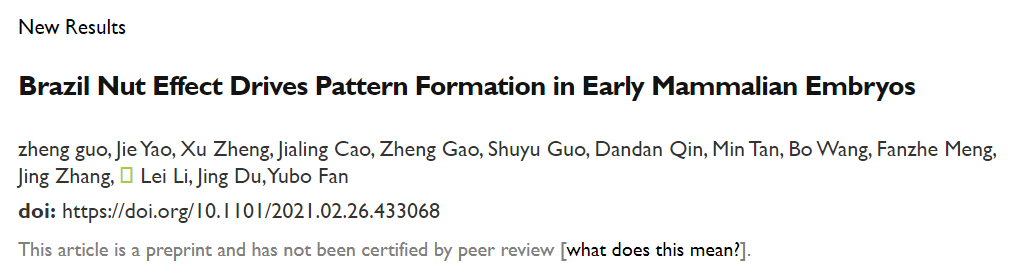 近期,北航生物医学工程高精尖创新中心樊瑜波、杜婧研究团队在bioRxiv上post了文章Brazil Nut Effect Drives Pattern Formation in Early Mammalian Embryos,结合实验和建模,首次发现小鼠囊胚发育中的模式形成是由一种类似“巴西果效应”的物理机制来驱动的。“巴西果效应”是指,如果一堆大小不同的坚果混合放到一个容器里,通过对这个容器施加振动,那么,由于重力作用,最大的巴西果通常会上升到表面,而较小的其他坚果会沉入杯底。巴西果效应最早来源于欧洲人常吃的一种由燕麦和巴西果等干果混合在一起叫做穆兹利的早餐,人们普遍发现在从装有穆兹利的罐子中往出倒的时候,早起的人倒出来的总是有较大的巴西果,而晚起的人倒出来的总是些其它小坚果。这种现象在生活中、工业生产中乃至地球物理以及天体探索等领域都有重要意义。本研究首次发现,在生命系统中类似的效应在胚胎发育中也起到关键的作用。