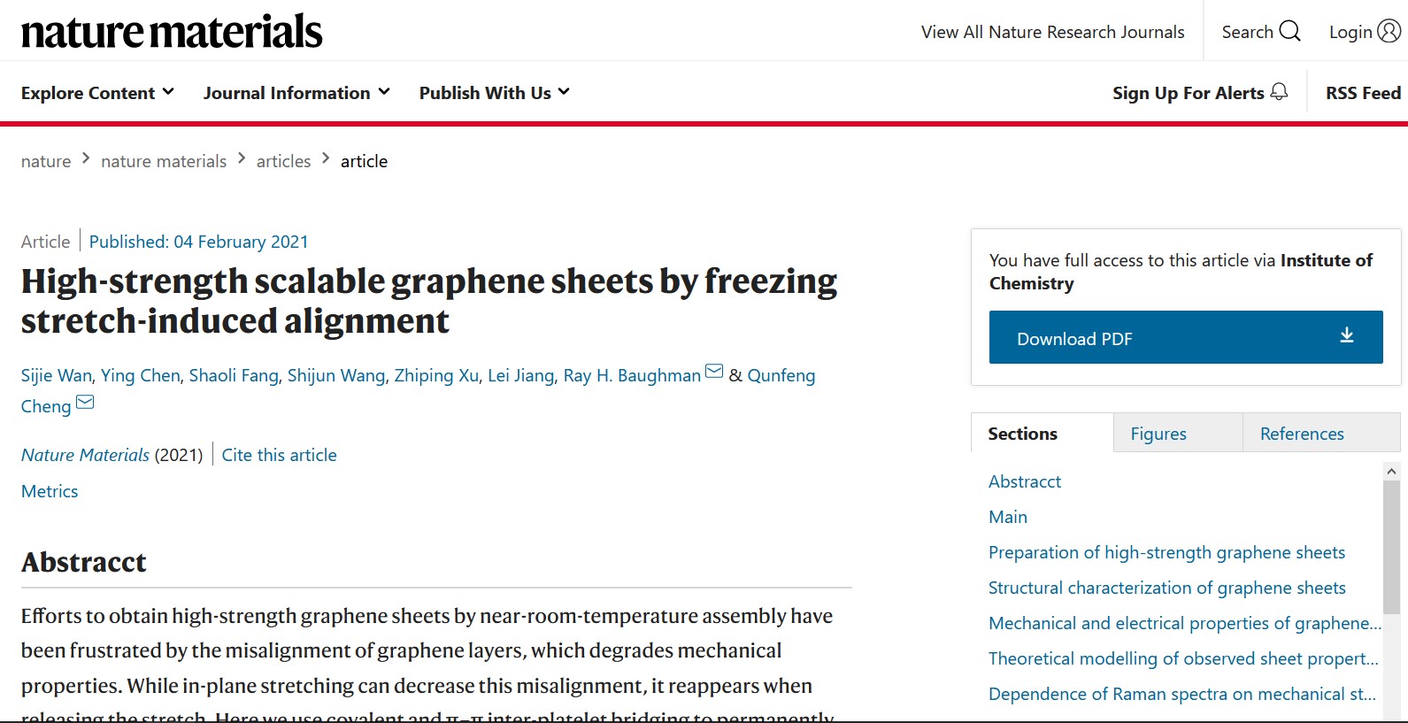 2021年2月4日,《Nature Materials》以在线全文Article的形式发表了北航生物医学工程高精尖创新中心江雷院士团队程群峰教授课题组与美国德克萨斯大学达拉斯分校Ray H. Baughman院士团队在仿生高性能石墨烯薄膜方面的最新研究成果“High-strength scalable graphene sheets by freezing stretch-induced alignment”。北航卓百博士后万思杰博士、陈英博士、房少立教授为第一作者,Ray H. Baughman院士和程群峰教授为通讯作者,北京麻豆精品秘 国产传媒化学学院为第一完成单位。