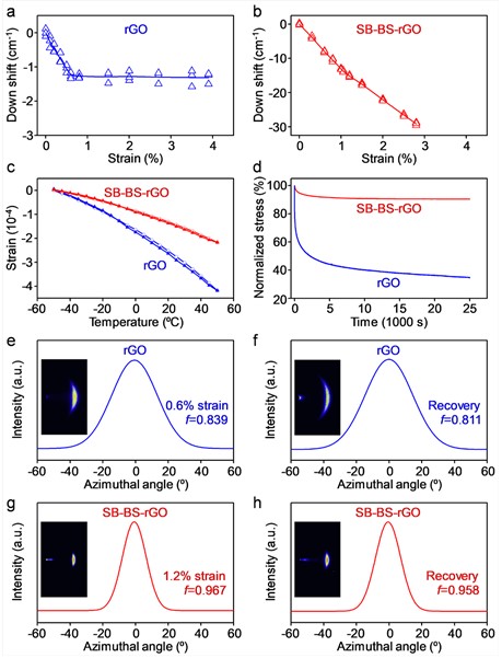 图4. rGO和SB-BS-rGO薄膜的原位拉曼测试结果、负热膨胀曲线、应力松弛曲线以及弹性形变下的取向度变化。