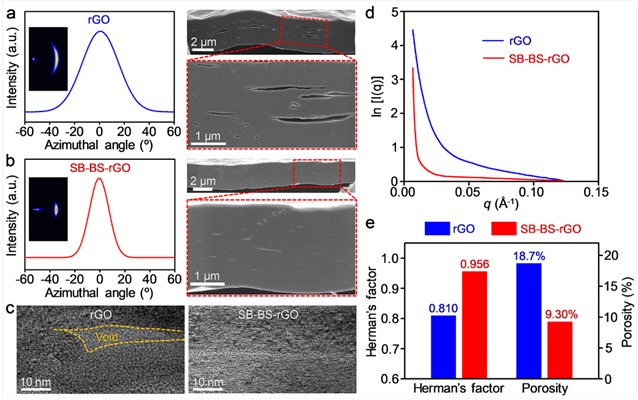图2. 石墨烯薄膜取向前(rGO)和取向后(SB-BS-rGO)的结构对比。