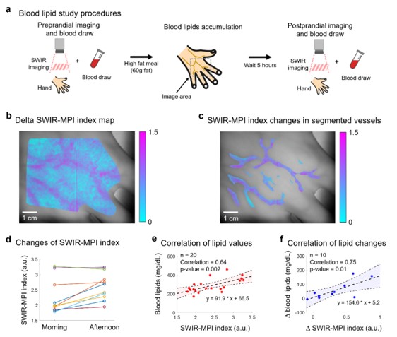 2.人体血液中脂肪的含量(血脂)与心血管疾病、肥胖症等密切相关。目前临床上血脂检查需采集静脉血进行测定,这一有创检测过程伴随痛感并存在感染风险,且检测速度较慢,难以对临床上血脂异常的早期干预和治疗提供实时反馈。该研究初步展示了对人体血脂的无创、非接触监测,如图3所示。