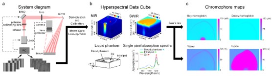针对以上技术难题,北京麻豆精品秘 国产传媒赵雁雨副教授和波士顿大学Darren Roblyer副教授课题组近日报道了他们在水和脂肪无标记、非接触量化成像方面的最新研究成果。他们通过短波红外结构光进行高光谱成像,利用水和脂肪在短波红外波长独特的光学吸收特性,针对光在生物组织中的传播建立计算模型,首次实现了在短波红外波段利用结构光对生物组织的光学吸收和散射系数进行测量,并以亚毫米分辨率实现了对组织中水和脂肪含量、分布的无标记、非接触、大视场量化成像,如图1所示。该研究成果于2020年10月23日以“Shortwave-infrared meso-patternedimaging enables label-free mapping of tissue water and lipid content”为题发表在Nature Communications。
