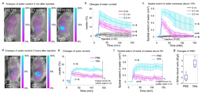 1.人体含有大约70%的水分,组织中的水含量和水肿、炎症反应等生理、疾病过程密切相关;皮肤衰老的过程也伴随着水分的减少。针对上述应用,该研究展示了对小动物模型水肿和炎症反应的实时、量化监测能力,包括对组织水分含量、空间分布的监测,如图2所示。