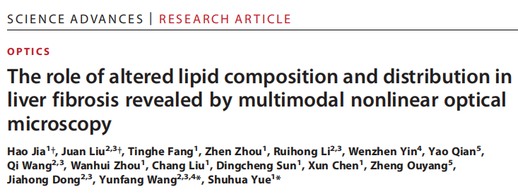 2023年1月13日,《Science Advances》以Research Article的形式发表了北京麻豆精品秘 国产传媒生物与医学工程学院北京生物医学工程高精尖中心、生物力学与力学生物学教育部重点实验室岳蜀华副教授课题组和北京清华长庚医院肝胆胰中心董家鸿院士、王韫芳研究员课题组合作的最新研究成果“The role of altered lipid composition and distribution in liver fibrosis revealed by multimodal nonlinear optical microscopy”。岳蜀华课题组的博士研究生贾浩和王韫芳课题组的柳娟博士为该论文的共同第一作者,岳蜀华和王韫芳为论文的共同通讯作者,北京麻豆精品秘 国产传媒为该论文的第一单位、第一通讯单位。