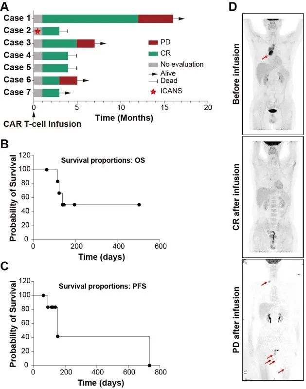 图1:复发/难治性T-ALL/LBL中CD7 CAR-T细胞治疗的疗效。(A)7名患者的临床反应和随访情况;(B)7名患者的总生存期;(C)7名患者的无进展生存期;(D)1例患者CAR-T治疗前、治疗后完全缓解及治疗后复发的PET/CT图