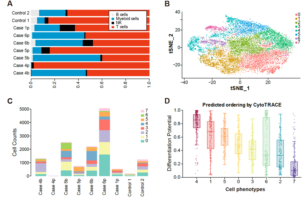 图3:免疫细胞重建与感染的关系。(A)每个scRNA测序样品中主要细胞类型的占比;(B)CD14+单核细胞分群及tSNE降维;(C)每个样本中八个单核细胞亚群的细胞计数;(D)单核细胞亚群的分化潜力排序