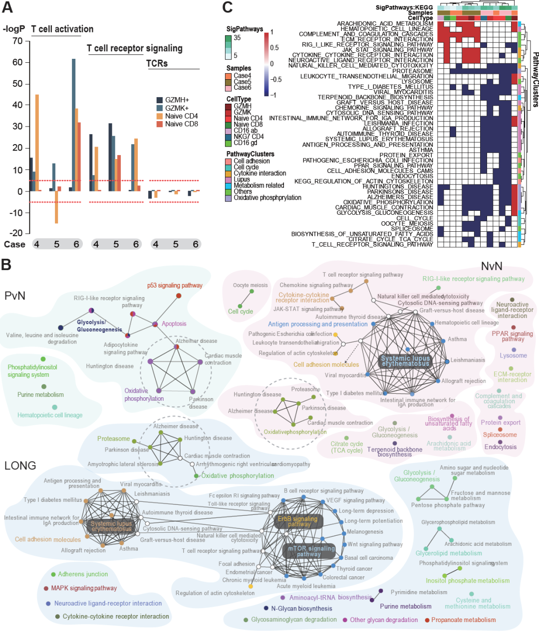 图2:CD7 CAR-T细胞治疗前后T细胞功能对比。(A)CAR-T治疗前后T细胞中T细胞活化、T细胞受体信号传导和T细胞受体相关基因集表达水平变化;(B)KEGG通路富集网络;(C)相同患者的治疗前后CD7- T细胞GSEA热图
