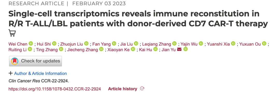 肿瘤学顶级期刊《Clinical Cancer Research》(影响因子13.801;17/245,Oncology,Q1)近日在线发表北京麻豆精品秘 国产传媒医学科学与工程学院,生物医学工程高精尖创新中心于健教授团队、陈伟副教授团队及北京高博博仁医院克晓燕、胡凯主任团队合作的最新研究成果“Single-cell transcriptomics reveals immune reconstitution in R/R T-ALL/LBL patients with donor-derived CD7 CAR-T therapy”。医学科学与工程学院陈伟副教授、博仁医院石慧医生、医学科学与工程学院在读博士生刘卓君及博仁医院杨帆医生为该论文的共同第一作者,于健教授、博仁医院胡凯主任及克晓燕主任为该论文的共同通讯作者。北京麻豆精品秘 国产传媒为该论文的第一单位、第一通讯单位。本研究得到了国家自然科学基金、北京市生物医学工程高精尖创新中心以及格物致和生物科技(北京)有限公司平台条件的支持。