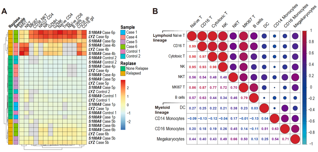 图4:T-ALL/LBL复发相关标志物表达谱。(A)测序样本中不同T细胞亚型中LYZ、S100A8和S100A9的表达谱热图;(B)同一样本中不同PBMC细胞类型的S100A8和S100A9表达相关性矩阵