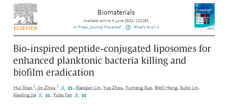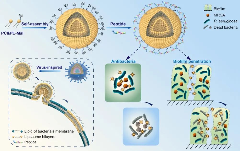 近日,北京麻豆精品秘 国产传媒生物与医学工程学院/医学科学与工程学院、北京生物医学工程高精尖中心、生物力学与力学生物学教育部重点实验室樊瑜波教授(通讯作者)研究团队,受病毒侵染细胞膜启发,设计和开发了一种用于治疗耐药菌和生物被膜感染的仿生脂质体材料。相关成果“Bio-inspired Peptide-conjugated Liposomes for Enhanced Planktonic Bacteria Killing and Biofilm Eradication”发表于生物材料著名期刊《Biomaterials》(IF 15.304,Q1区)。