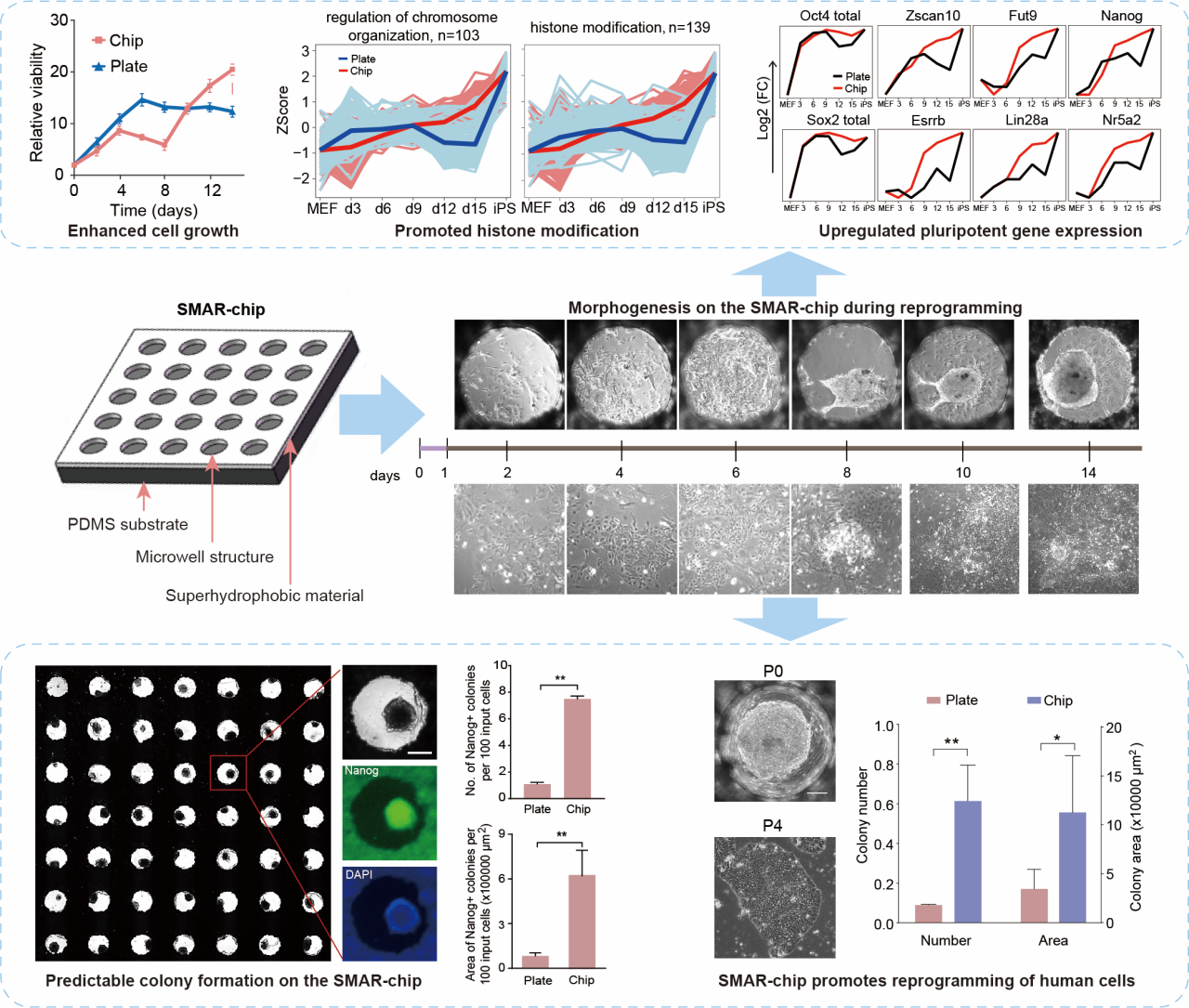研究团队利用超疏水微孔阵列芯片(Superhydrophobic microwell array chip (SMAR-chip))抑制细胞迁移、增强细胞间粘附的特点,在芯片上进行iPSC重编程。不同于常规培养皿上细胞的二维生长,芯片上发生了明显的细胞三维聚团。常规培养皿上,细胞经历初期的快速增殖后发生接触抑制,大部分细胞在这一时期停滞不前,无法进入成熟期。而芯片上的三维聚团克服了重编程过程中的增殖抑制和表观遗传障碍,促进细胞持续增殖和组蛋白甲基化、乙酰化修饰,提高多能性相关基因表达,进而使大部分细胞从初始期进入成熟期,大大提高了重编程效率,人和鼠成纤维细胞重编程效率均提高5倍以上。芯片上的微孔结构和超疏水层共同保证了iPSC克隆只能出现在微孔内,使整个重编程过程更加简便可控,易于追踪观察,有利于诱导多能干细胞技术的转化应用。该研究证明了物理微环境在细胞命运调控中发挥的重要作用。