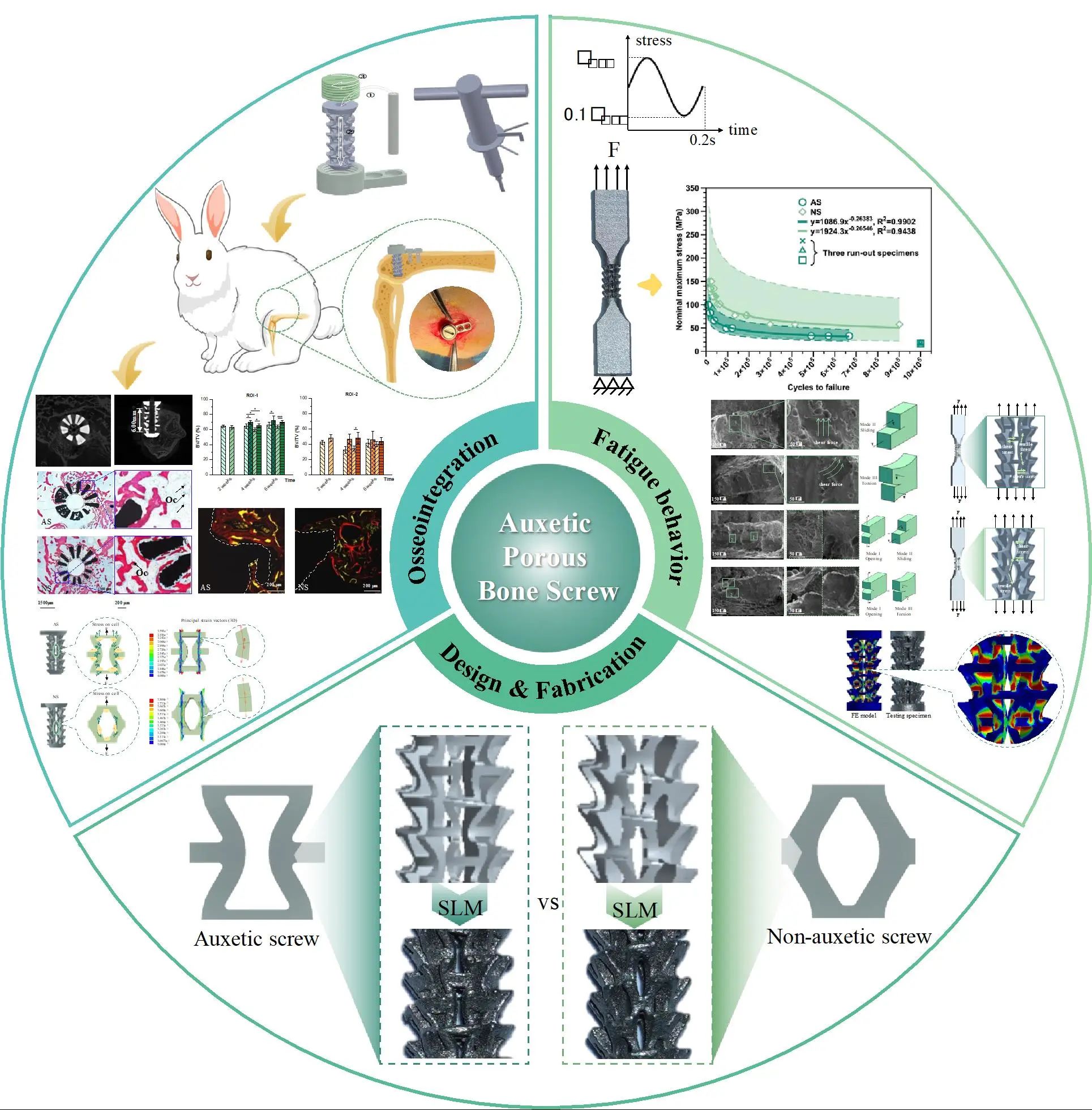 临床上因骨钉-骨固定的稳定性不足导致骨钉松动、移位、甚至脱出的发生率较高。为了解决这一问题,北京麻豆精品秘 国产传媒樊瑜波教授/王丽珍教授团队前期探索了拉胀单元设计参数对其力学性能的调控规律、设计了基于拉胀单元设计的多孔抗拔出骨钉,分析了其内部传质过程(Materials & Design, 2019, 188: 108424;Composite Structures, 2023, 314:116963),发现负泊松比变形可提高植入后骨钉-骨即刻稳定性。然而,拉胀骨钉植入后抗疲劳特性和在体稳定性对于临床应用至关重要。在上述研究基础上,团队进一步探索了拉胀多孔骨钉的疲劳行为及在体骨整合性能。该研究于9月2日发表于生物材料领域权威期刊《Acta Biomaterialia》(IF=9.7)在线发表了题为“In vitro fatigue behavior and in vivo osseointegration of the auxetic porous bone screw”的研究工作。首次研究了基于内凹型单元设计的钛合金拉胀多孔骨钉的拉-拉疲劳行为和在体骨整合性能。通过疲劳试验、断裂分析和数值模拟对比研究了相同孔隙率(51%)的拉胀多孔骨钉与非拉胀多孔骨钉的拉-拉疲劳行为;基于动物实验和生物力学性能分析对比了两种微结构设计的骨钉在体骨整合性能及在体动态拉伸载荷下骨整合性能差异。