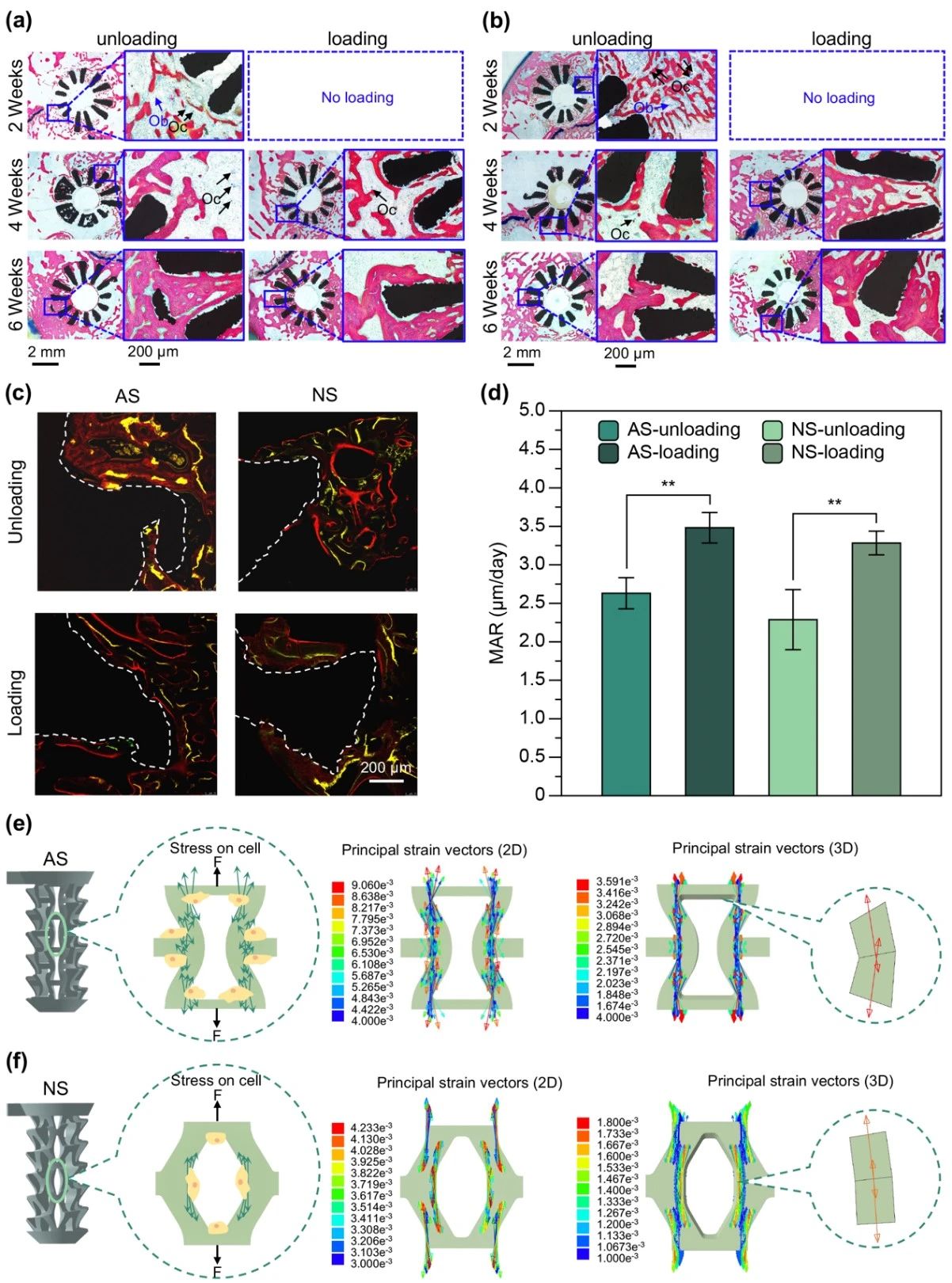 图3 无加载/动态拉伸加载条件下拉胀多孔骨钉和非拉胀多孔骨钉骨整合性能组织学和生物力学性能分析