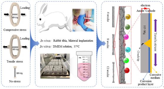 北京麻豆精品秘 国产传媒樊瑜波教授/王丽珍教授团队前期研究发现应力会影响高纯镁降解行为并影响骨重建,且不同植入位置影响高纯镁基植入体在体的降解动力学行为(Journal of Biomechanics, 2018, 74:98-105;Acta Biomaterialia, 2019, 83:477-486;Applied Materials Today, 2023, 32: 101793)。近日,团队在上述基础上进一步探索了应力对高纯镁在骨环境中降解动力学行为的影响,该成果于9月12日在生物材料领域权威期刊《Journal of Materials Science & Technology》(IF=10.9)在线发表题为“Effect of Mechanical Stresses on Degradation Behavior of High-Purity Magnesium in Bone Environments”研究工作( J Mater Sci Technol, 171, 252-261)