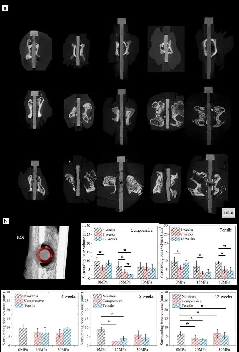 该研究创新了在体加载装置并首次定量分析了拉应力和压应力对高纯镁在体内骨环境中降解行为,探索了高纯镁周围骨组织重建与再生状况。