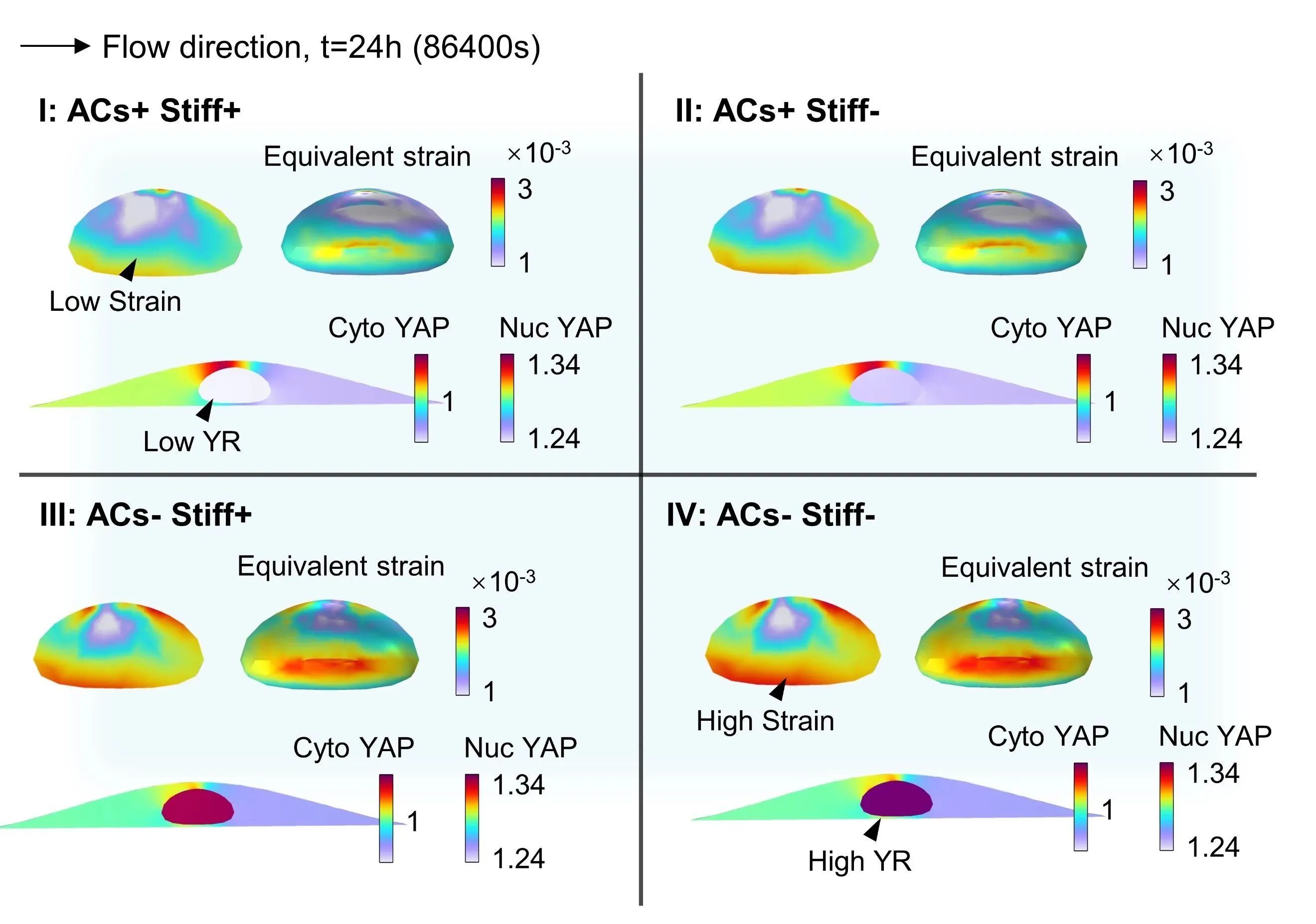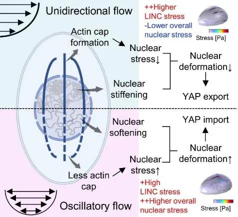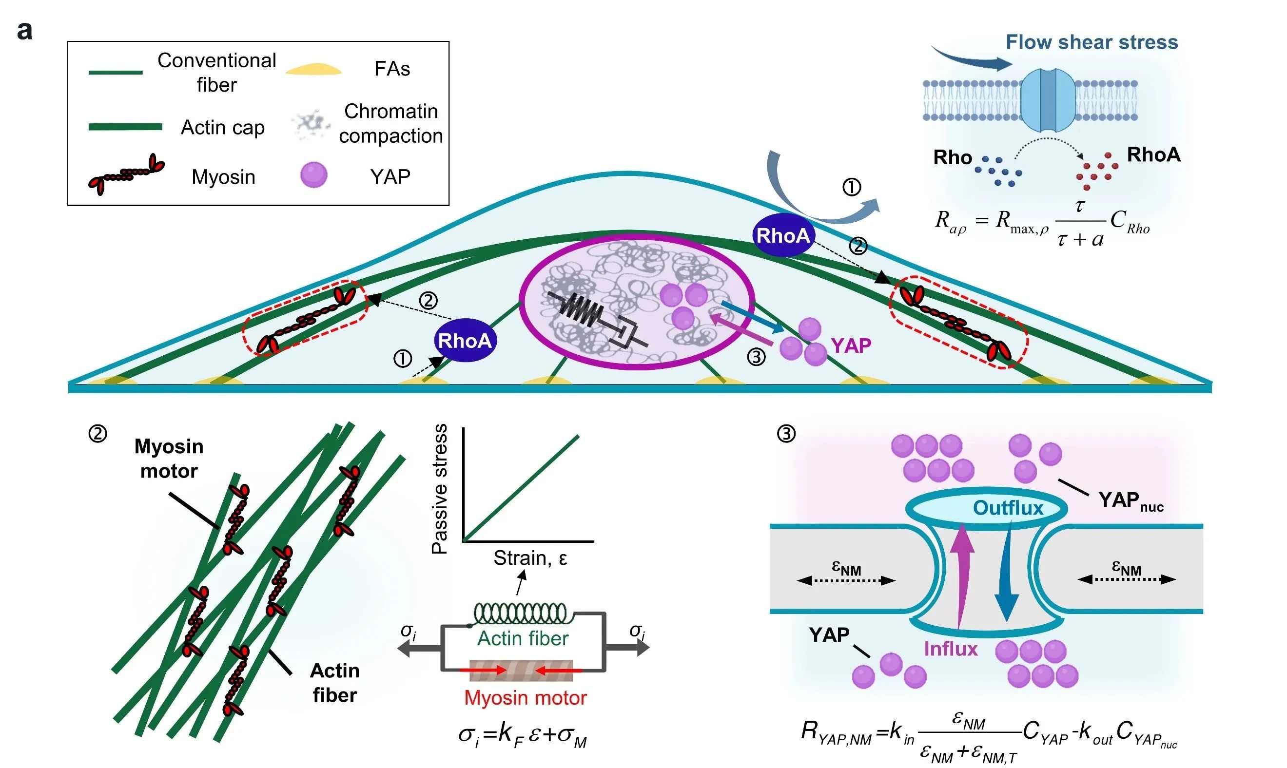 细胞外力学环境调控转录因子的核质运输,这一过程是决定细胞功能的基础,也是理解和干预动脉粥样硬化、血管新生等多种生理和疾病发生、发展的关键。然而,关于流动剪切力如何诱导细胞内力学生物学的重构,将胞外力学信号传导至细胞核,从而调控核质输运的力学机制目前尚不清楚。