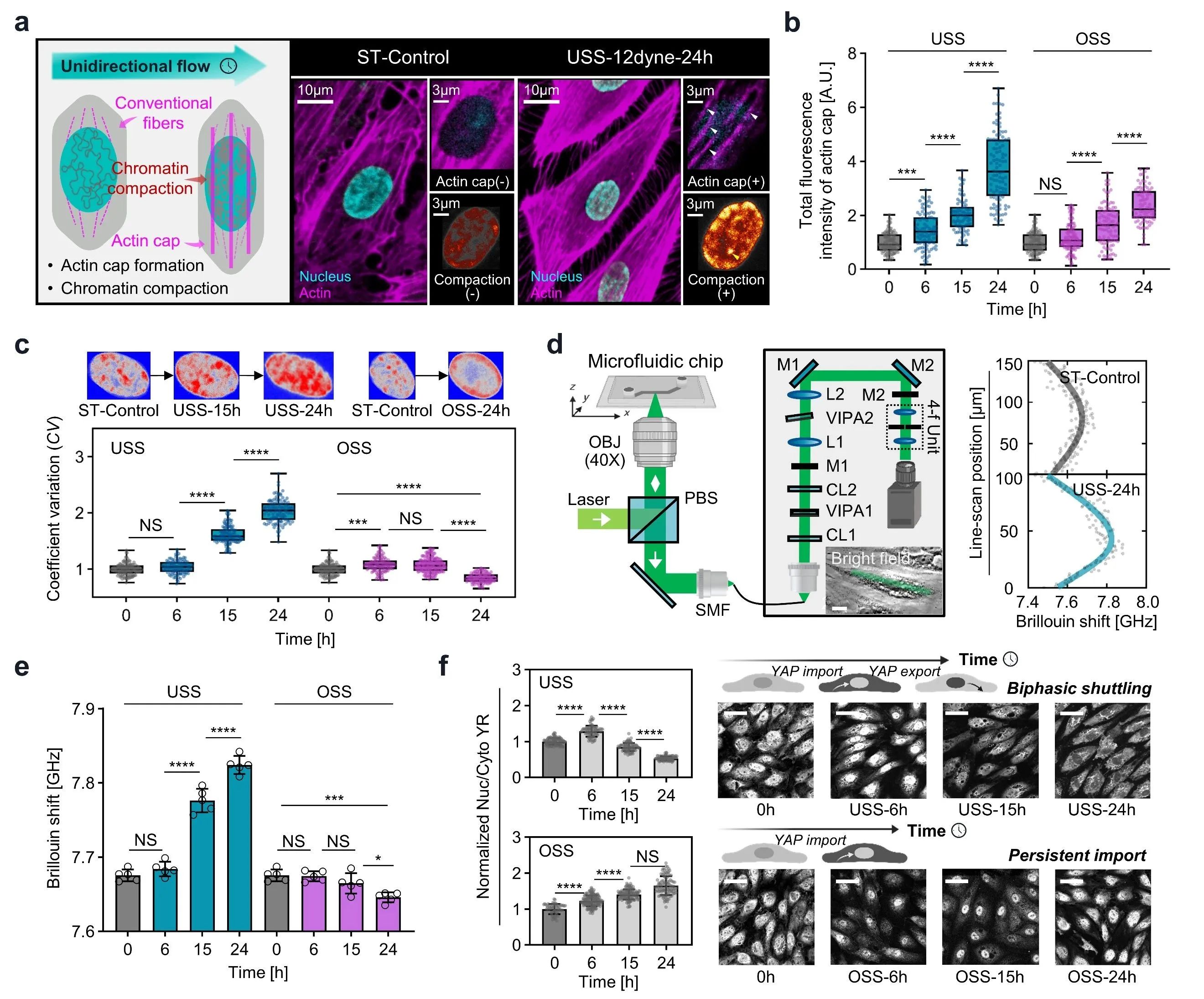 该研究整合了血管微流控芯片技术与布里渊显微技术,发现流动剪切力会诱导内皮细胞形成核周肌动蛋白帽和细胞核硬化,这两个过程共同调节Yap转录因子“先入核后出核”的双向核质运输过程(图2)。