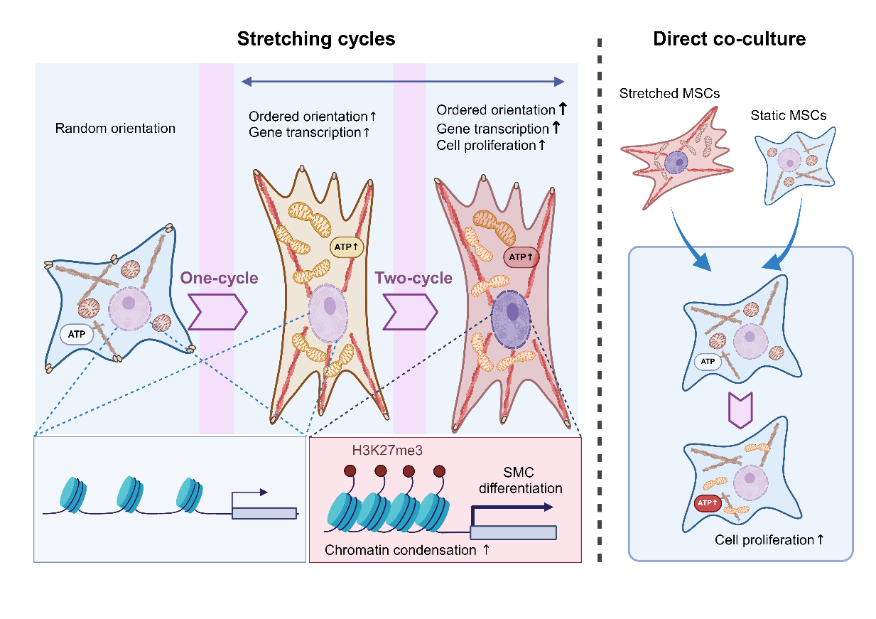 综上所述,该研究深入揭示了染色质和能量代谢重塑介导间歇拉伸的力学记忆可促进间充质干细胞的增殖和平滑肌分化,并创新地提出了力学记忆能够通过细胞间的直接接触传递。该研究为理解力学记忆的潜在机制提供新的观点,并为再生医学领域通过模拟细胞力学微环境促进组织修复和临床治疗的干细胞赋能等提供新的思路。